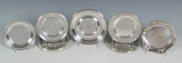 STERLING PLATES & 2 SILVER TRAYS: Includes 1) 5 Gorham plates, 6 3/8'' dia. 2) 5 ''G'' hallmarked plates, 6 1/8'' dia. 3) Marcus & Co. plate 6'' dia. All plates monogrammed E. 4) Mauser tray, monogrammed, 6 1/2'' square. 5) Reed & Barton underplate 7 1/8'' dia. Approx 51.0 troy oz.