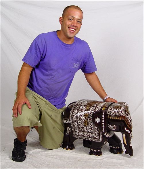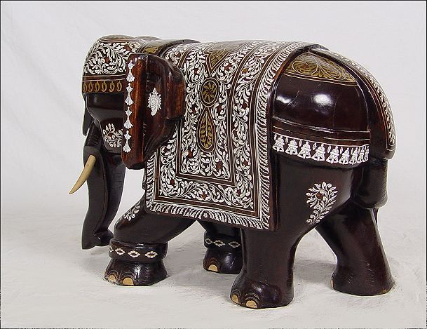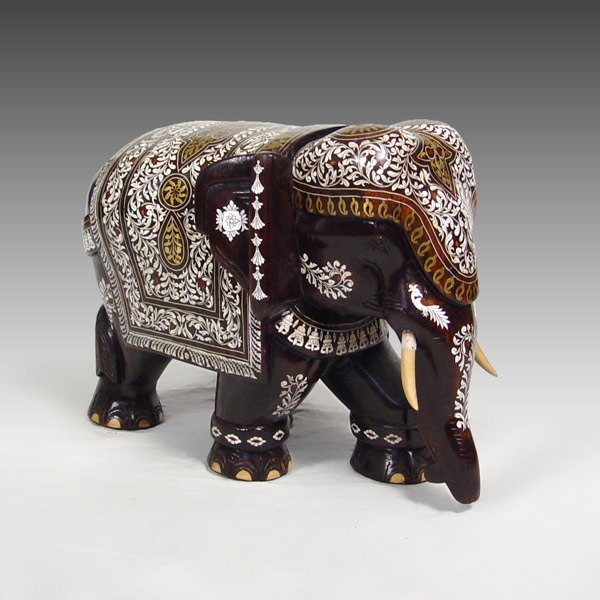 LARGE BONE INLAID MAHOGANY ELEPHANT: 18 1/2'' h. x 24'' x 14'', 50 lbs