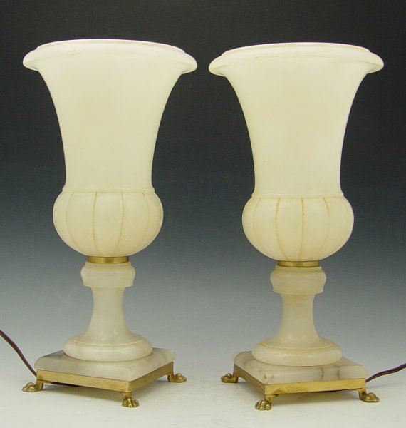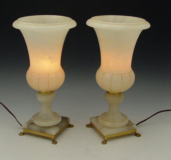 PAIR URN SHAPED ALABASTER TABLE TOP TORCHIER LAMPS: Mounted on brass paw feet. 13'' high x 7''