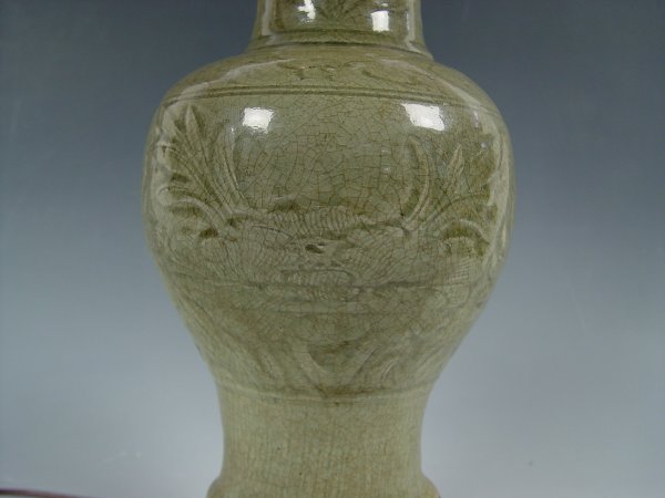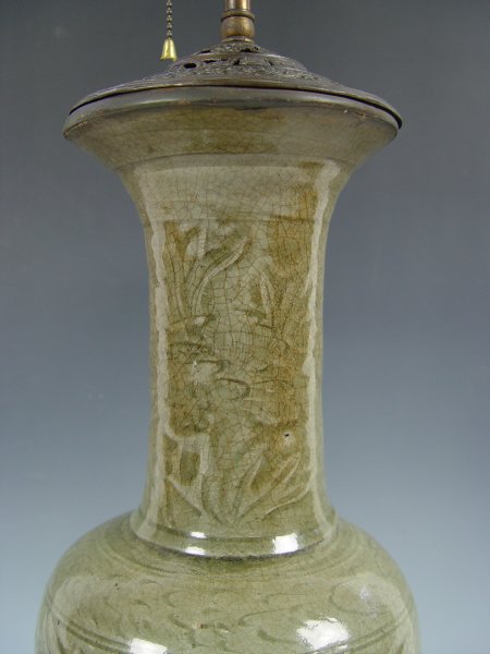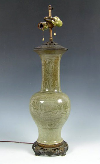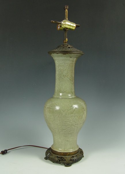 CHINESE YEN YEN CELADON VASE: With later metal fittings for a lamp. The base with symbols for longevity. Ceramic is 16 1/4'', the lamp is 27''h. overall.