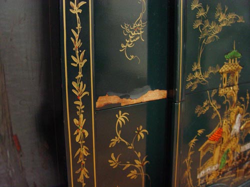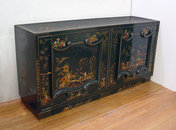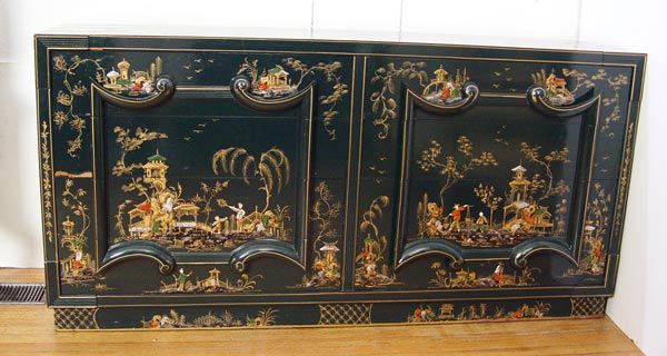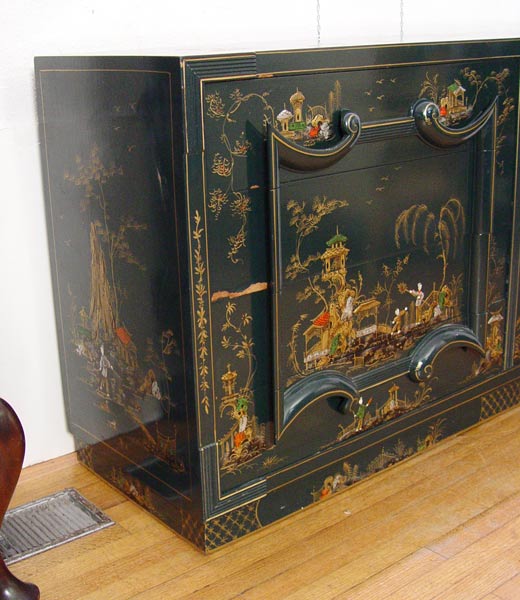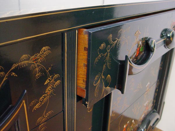 CHINOISERIE RICHLY DECORATED 8 DRAWER DRESSER SIDEBOARD: 8 compartmented drawers hidden in the design of the dresser. Dark green ground. 5'2'' long x 3'' tall x 20'' deep. .