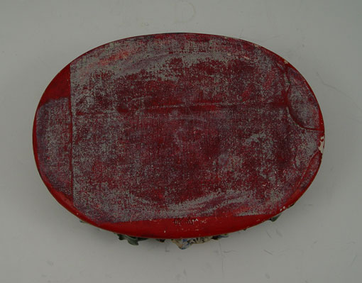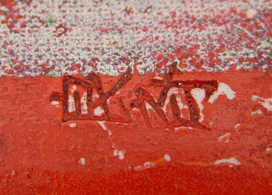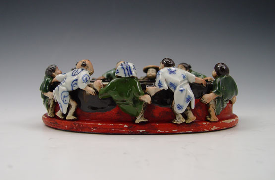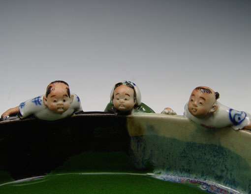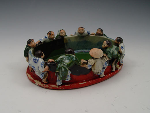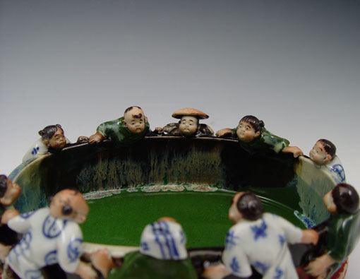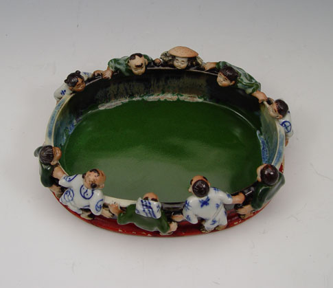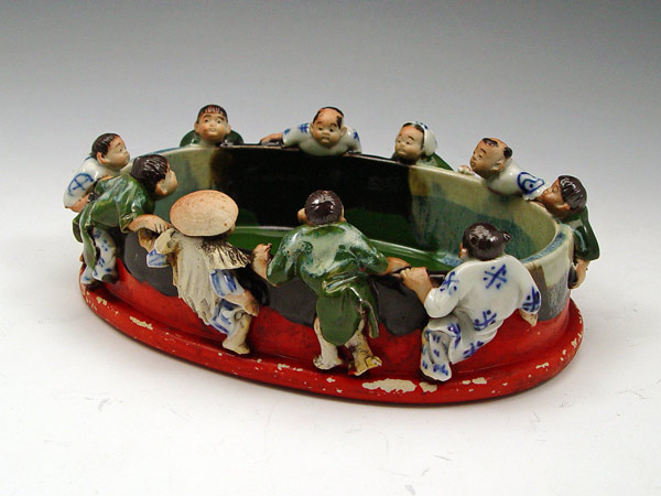 JAPANESE SUMIDA GAWA EARTHENWARE BOWL: 10 figures hanging on to the bowl. 3''h. x 11'' x 6''.