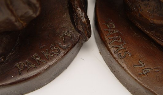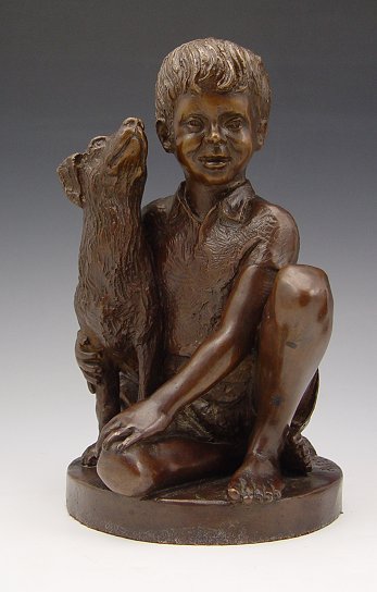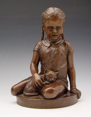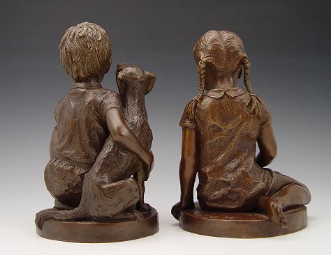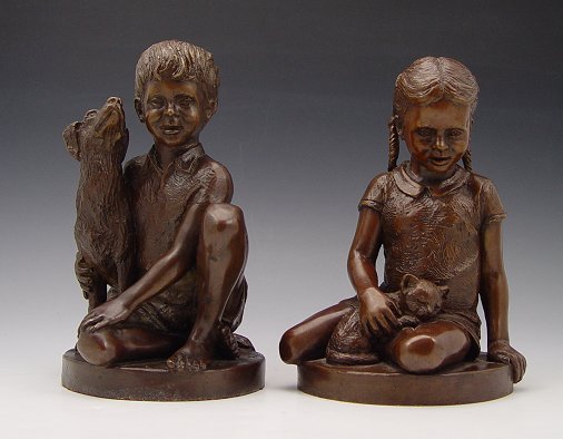 PARKS, Charles, (American, 1922-): Pair Child Bronzes; Seated girl with kitten, Kneeling boy with dog, 9''h. each, both are signed and dated '74.