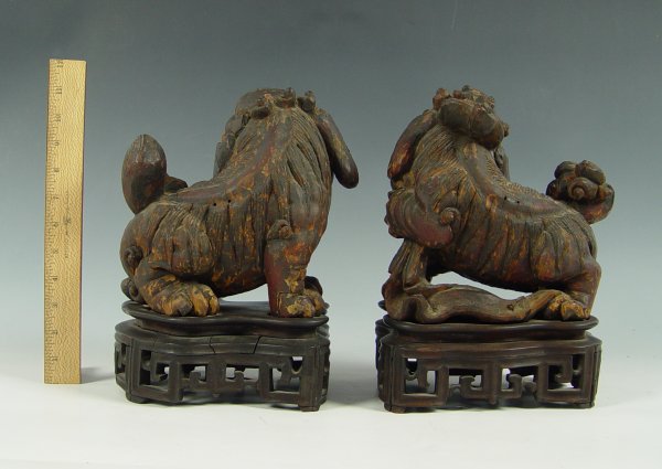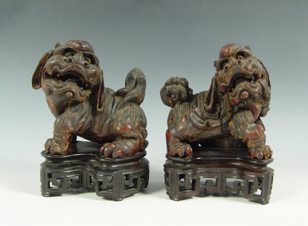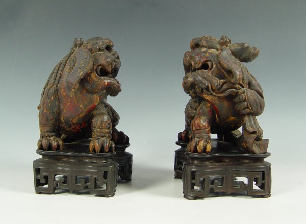 2 CHINESE CARVED WOOD FOO LIONS: With remnants of gilt lacquer, worn condition. 11'' h. x 8''