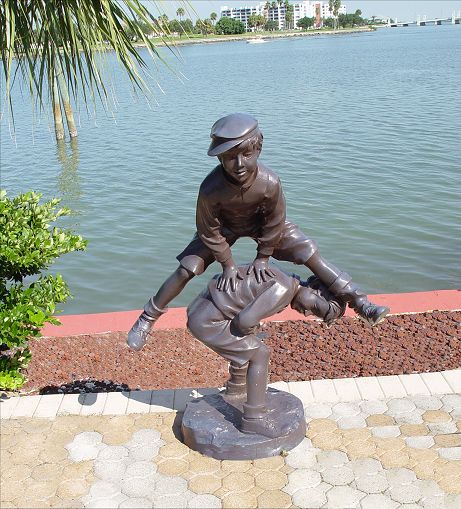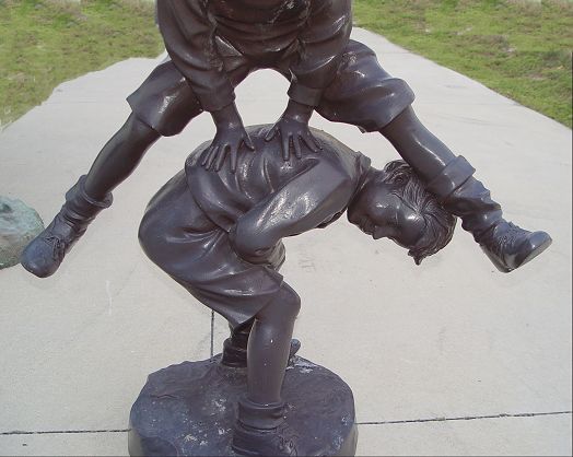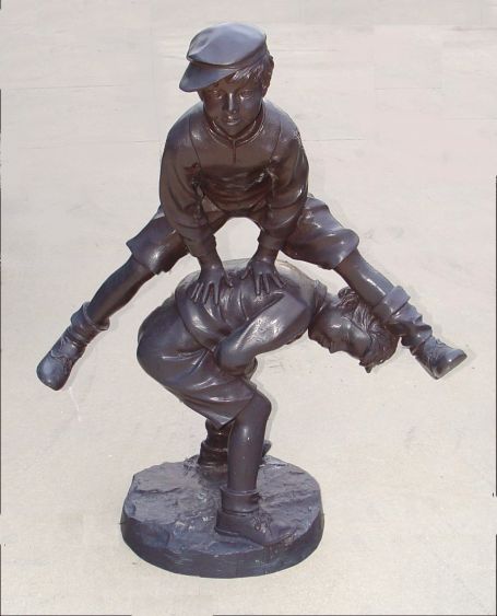 LARGE BRONZE CHILDREN PLAYING LEAPFROG: Note finish and paint flake. Measures approx. 51 1/2'' h. x 39'' x 23''.
