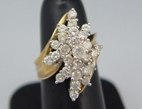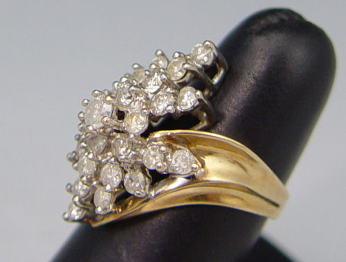 10K DIAMOND & PRINCESS RING: 10K yellow gold cluster ring contains 27 round full cut diamonds. Weight: 1.50 Ct. Approx. The diamonds average I1-I2 in clarity and J-K in color. The diamonds are prong set. Weight: 7.4 grams. Size: 7