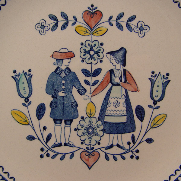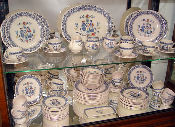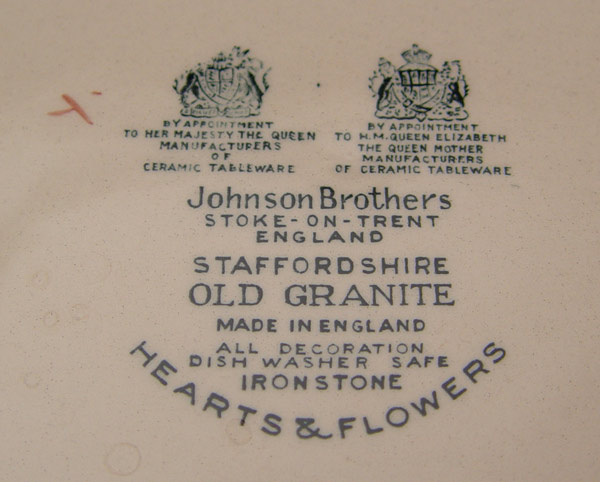 STAFFORDSHIRE OLD GRANITE HEARTS AND FLOWERS DINNERWARE FOR 12: Approx. 97 pieces to include 15 dinner plates, 13 salad plates, 15 bread plates, 12 bowls, 18 cups, 18 saucers, 3 platters, 2 cream pitchers and a sugar.