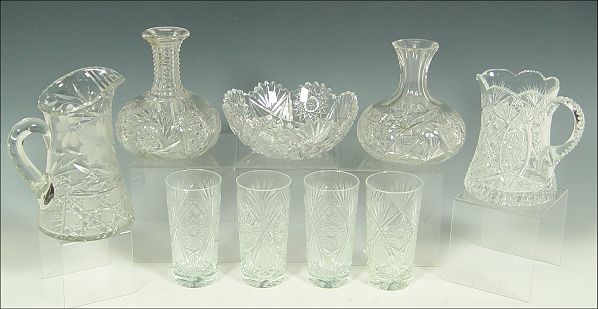 9 PIECE GROUP BRILLIANT CUT GLASS: To include 2 water pitchers, 2 water decanters, 4 tall tumblers, and a berry bowl. Brilliant period and more recent Bohemian cut.