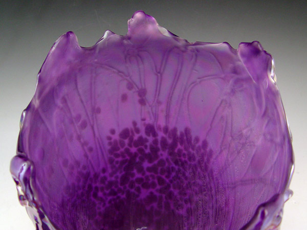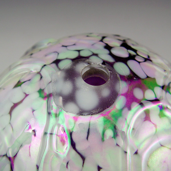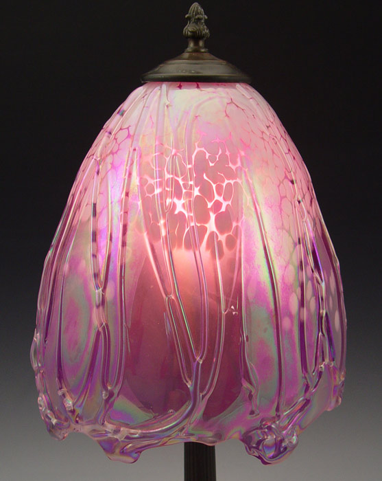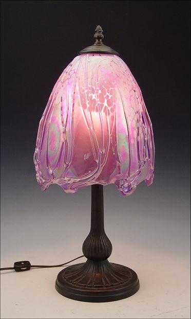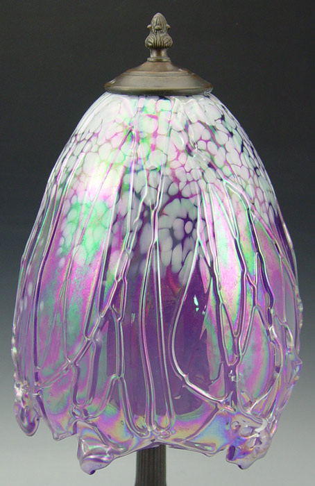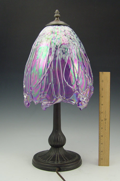 ERIC BRACKEN GLASSHOUSE GALLERY ART GLASS LAMP: Seattle iridescent lavender glass shade, unsigned. Lamp is 20'' high, the shade is 9'' dia.