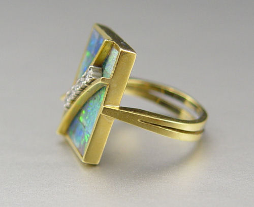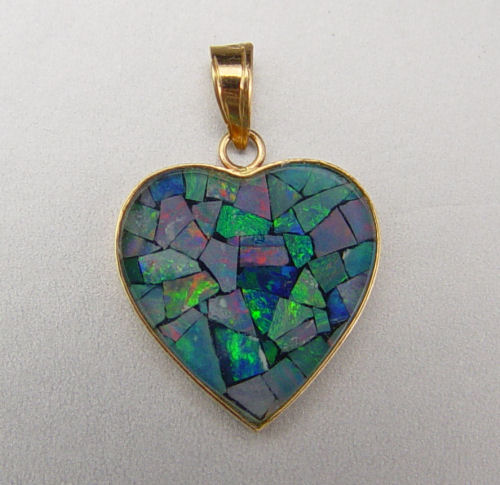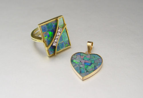 HEART SHAPED OPAL MOSAIC PENDANT AND RING: 1) 14K yellow gold heart shaped pendant contains one 16.0 x 16. 00 mm opal mosaic doublet. Weight: 1.0 grams. 2) 18K yellow gold ring contains one rectangular shaped opal mosaic doublet (crazed). Five round brilliant cut diamonds. Weight: .12 Ct. Approx,. Rated VS in clarity and H in color. The diamonds are prong set. The doublets are epoxy set. Weight: 6.1 grams. Size: 5