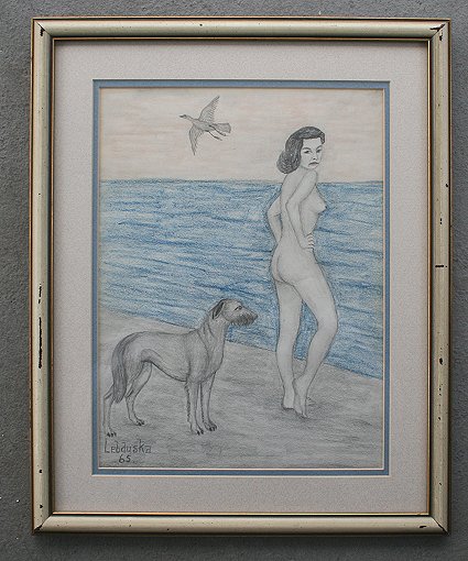 LEBDUSKA, Lawrence, (American, 1894-1966): Nude with Dog on a Beach, Color Pencil Drawing, 13 1/2'' x 10'', signed and dated '65, silver gilt frame with wear, 131/2'' x 10.
