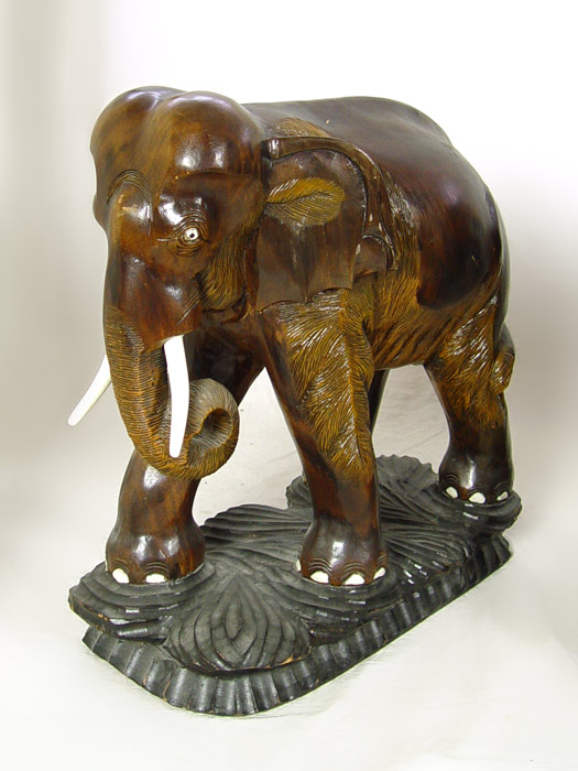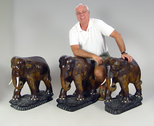 COLLECTION OF 3 CARVED WOOD ELEPHANTS: To include 1) 26'' x 24'' x 12'', 59 lbs. 2) 26'' h x 22'' x 11 1/2'', 68 lbs. 3) 25'' h. x 24'' x 12'', 64 lbs.