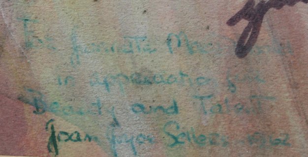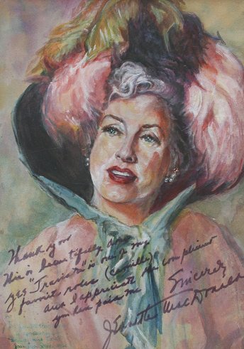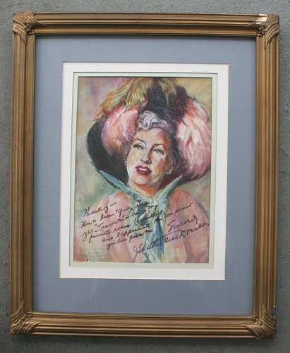 PAINTING OF JEANETTE MACDONALD, FAMOUS AMERICAN SINGER AND ACTRESS: 18'' x 9 1/4'' sight size, illegibly signed and dedicated Joan Joyce Scherr?, carved and gilded gesso frame, 23'' x 19''.