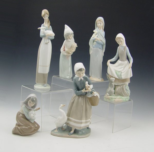 COLLECTION OF 6 LLADRO FIGURINES: To include 1) ''Rabbits Food'' 4826, retired 1991. 9'' h. 2) ''Girl with Rooster'' 4677, retired 2001, 7 3/4'' h. 3) ''Lost Lamb'' 5484, not retired. 5'' h. 4) ''Girl with Lamb'', retired 2001. 10 1/2'' h. 5) ''Shepherdess with Ducks'', 4568. Retired 1993. 9'' h. 6) Girl with Lillies. 9'' h.