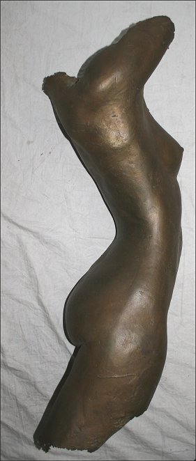 BRONZE FEMALE NUDE TORSO WALL SCULPTURE: Illegibly signed, 32'' h.