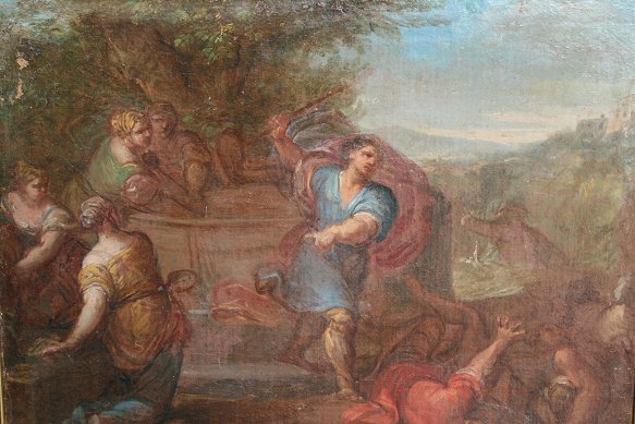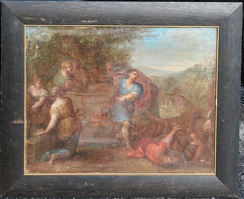 OLD MASTER OIL/CANVAS MOSES DEFENDING JETHRO'S DAUGHTERS AT THE WELL: 19 1/2'' x 25 1/2'', oak frame with wear, 26'' x 31 1/2''.