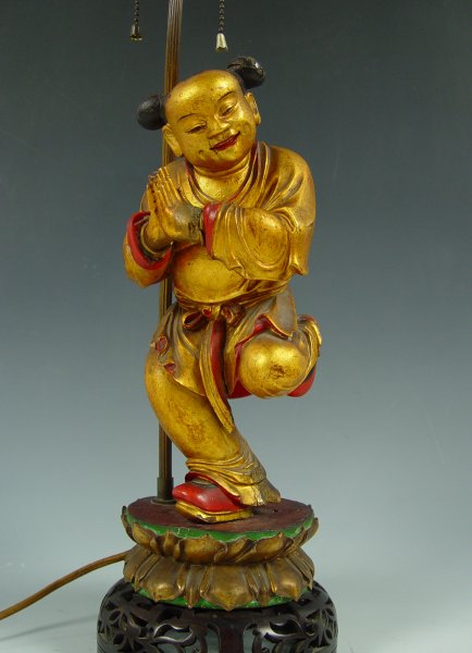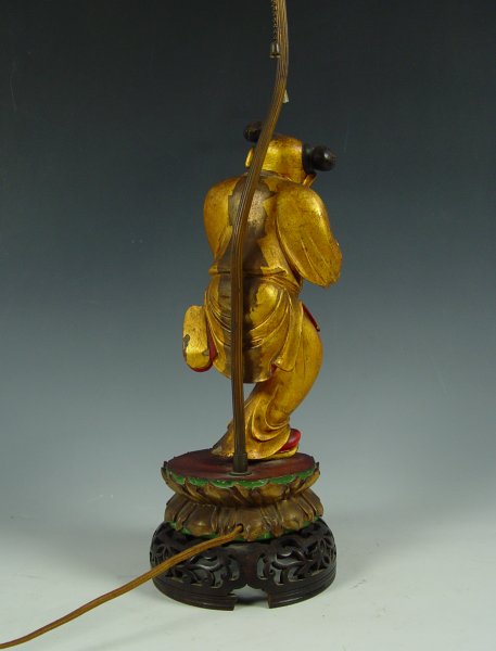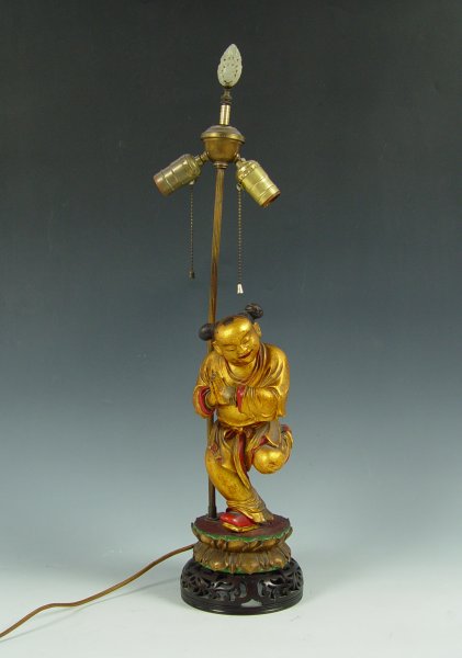 CHINESE DANCING IMMORTAL LACQUERED WOOD FIGURE MOUNTED AS A LAMP: Double socket pull chain lamp with carved stone finial. 29'' tall.