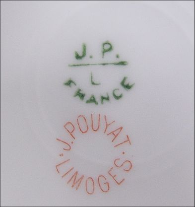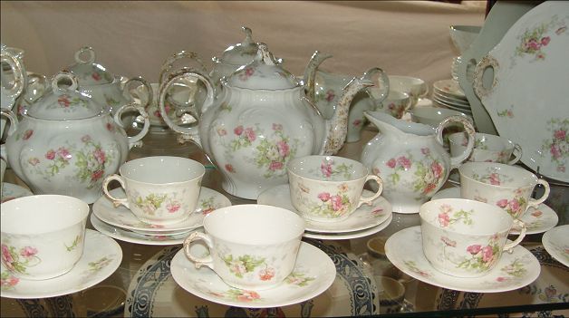 FRENCH LIMOGES BREAKFAST OR DESSERT CHINA SERVICE: Jean Pouyat, Ca. 1891-1932. Approx. 49 pieces to include teapot, creamer, covered sugar, 2 pierce handle serving plates, 12 plates ( 7.5''), 11 fruit or dessert bowls, 9 cups and 12 saucers.