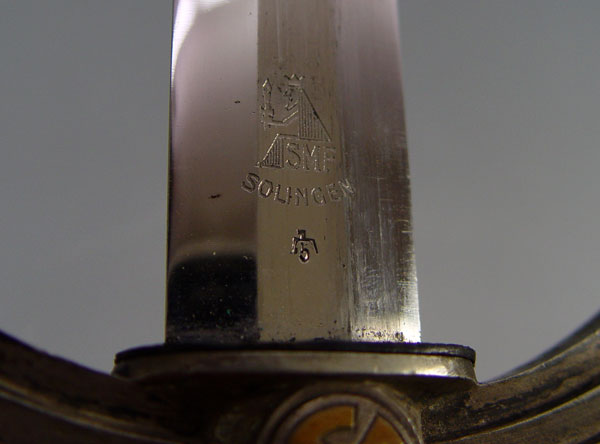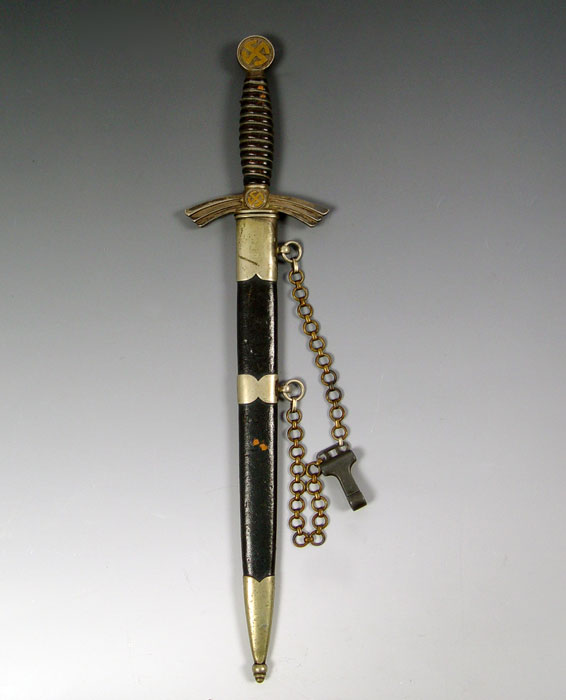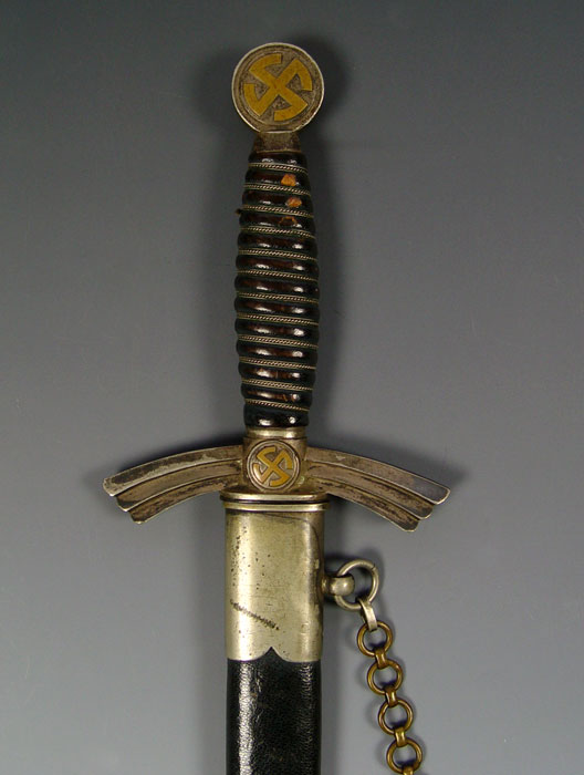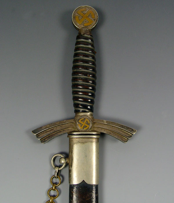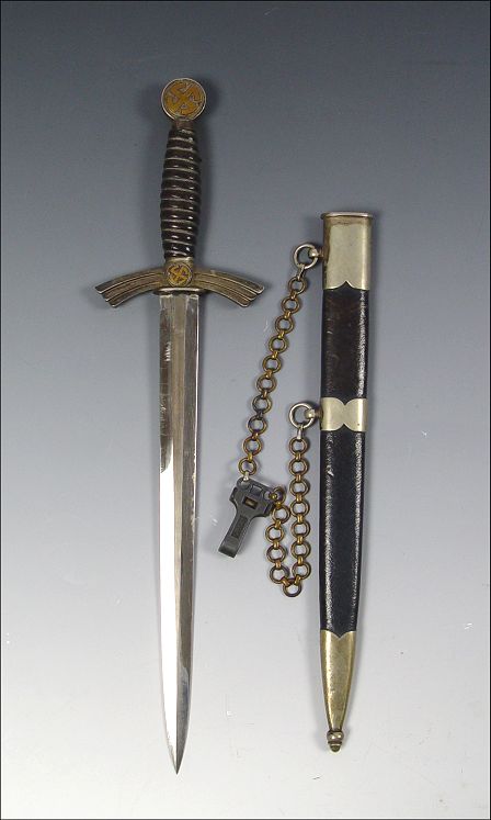 WWII GERMAN LUFTWAFFE 1ST PATTERN SMF DAGGER: Clean 12'' blade well marked SMF. Original leather and twist wire. Original scabbard stamped 120 on throat, with original chain hanger. 19'' overall in scabbard.