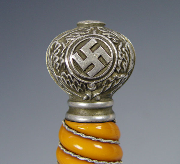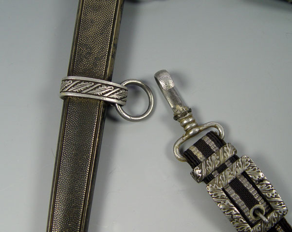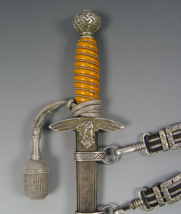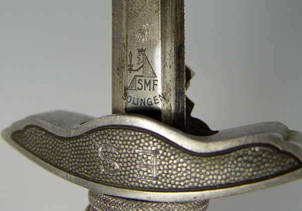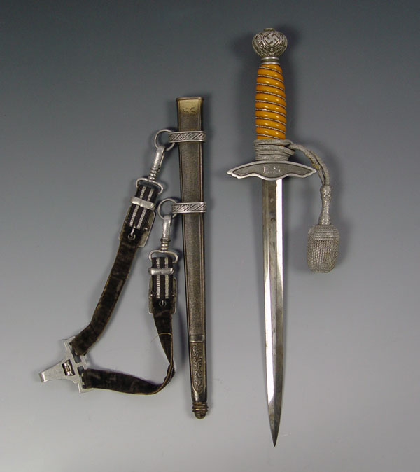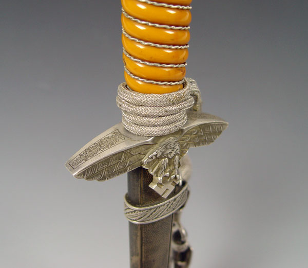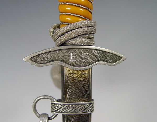 WWII GERMAN SMF LUFTWAFFE 2ND PATTERN DAGGER: Eagle cross guard with orange grip, original wire. 10 1/2'' blade well marked SMF. Original silver knot. Original scabbard with hanger. Both cross guard and scabbard engraved with owners initials ES. Measures 16 3/4'' long overall.