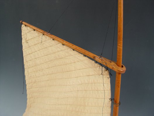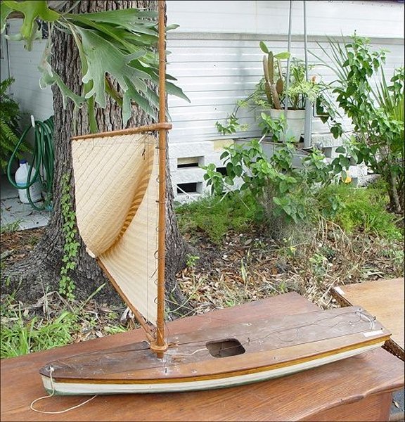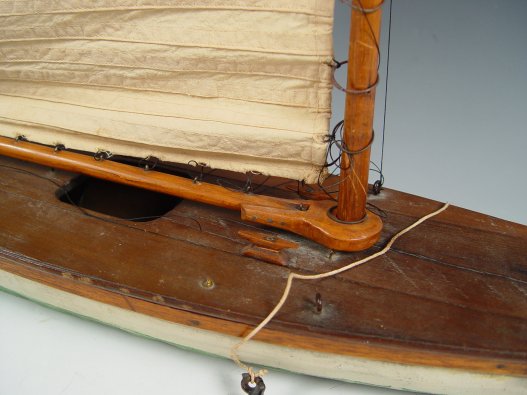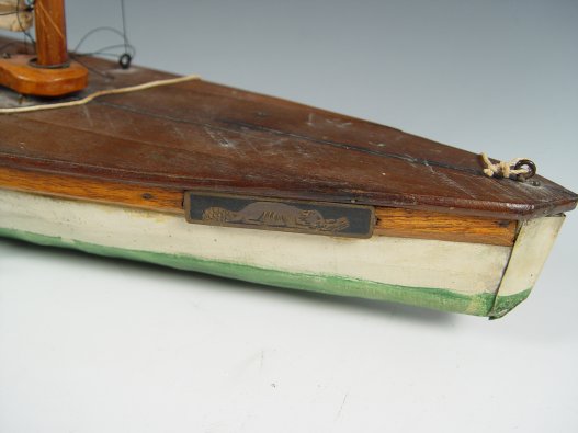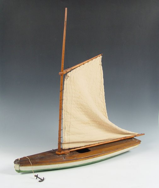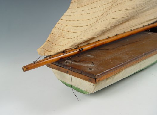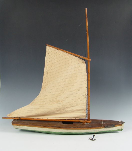 VICTORIAN CHILDS POND BOAT: Circa early 20th century. Original green / white paint and single cotton sail. Handcrafted with brass plaque of beaver. Measures 32 1/2'' h. x 30'' x 7 1/4''.