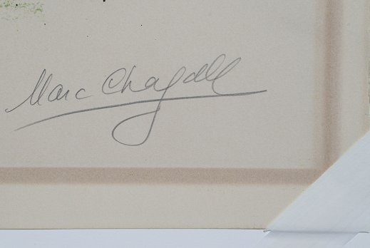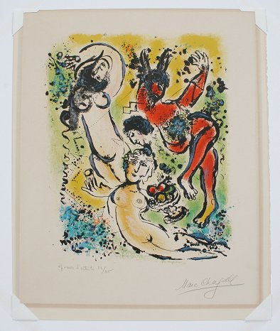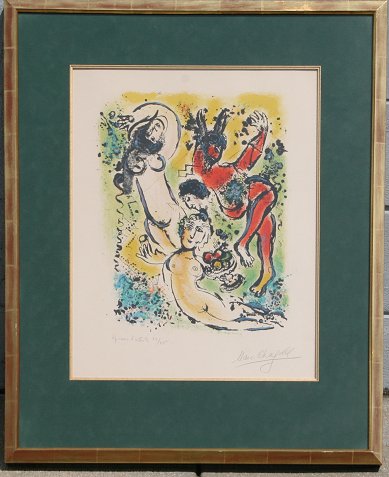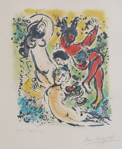 CHAGALL, Marc, (Russian/French, 1887-1985): ''Come Muses, Sing this Rural Song'', Lithograph in colors on Arches paper, 23 7/8'' x 19 5/8'' with margins, signed in pencil lower right margin, edition number E.A. 12/25 in lower left margin, fine gilded frame with minor wear, 34'' x 28'', archivally matted, Harcourt's Gallery label verso.