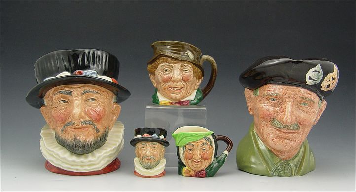 LOT OF 5 ROYAL DOULTON TOBY JUGS: To include 1) Beefeater D6206 6'' h. 2) Monty D6202 5 3/4'' h. 3) Paddy 3 1/4'' h. 4) Sairey Gamp 2 1/4'' h. 5) Beefeater 2 1/4'' h.