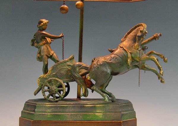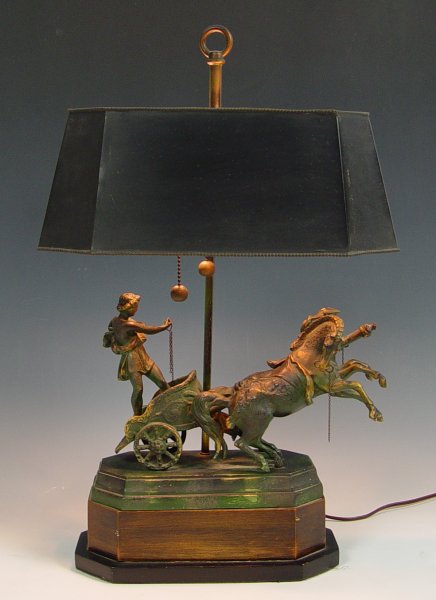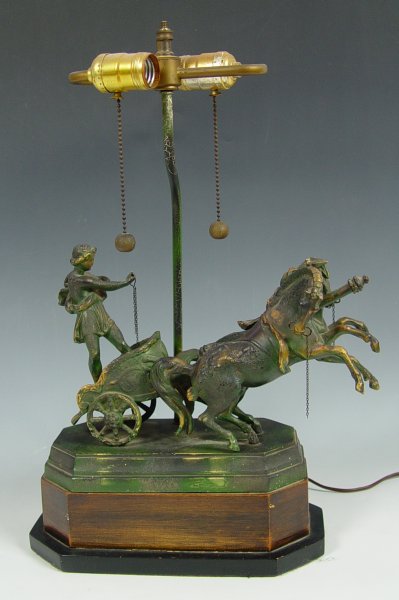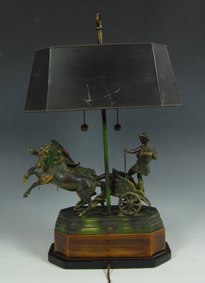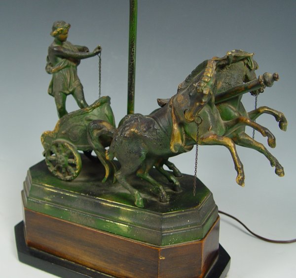 DECORATIVE FIGURAL CHARIOT LAMP: Bronzed metal figure of chariot on wood base. Signed Collection Francaise Made in USA. Metal shade. 2 socket lamp. Measures 24'' h. x 12'' x 6 1/2''