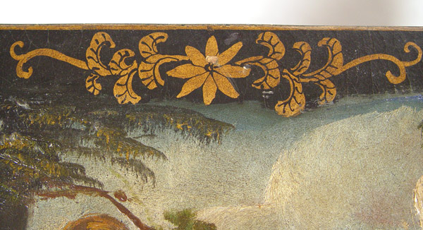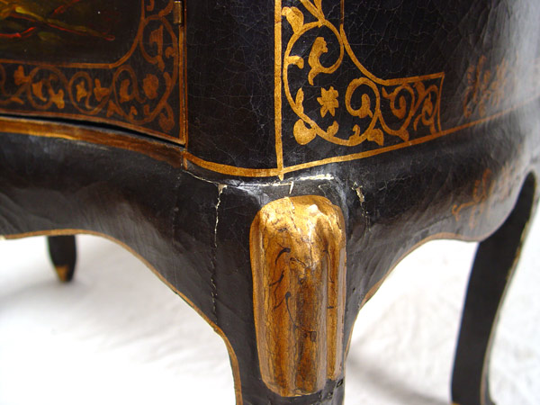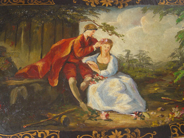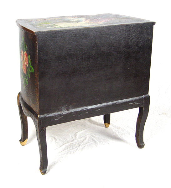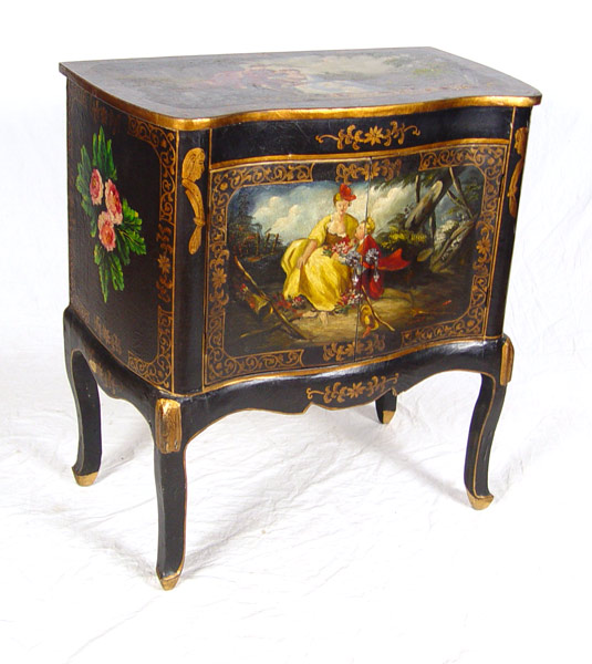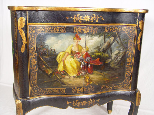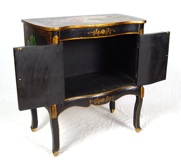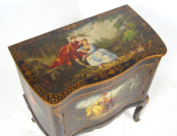 LATE 20TH C PAINT DECORATED FRENCH STYLE CABINET: 2 door side cabinet decorated with couples in love among a natural landscape, attached bracket base with tall legs and spade feet, 35''h. x 31 1/2'' x 18 1/2''.