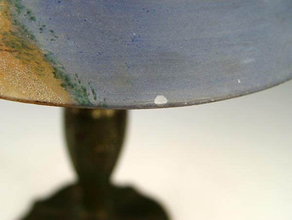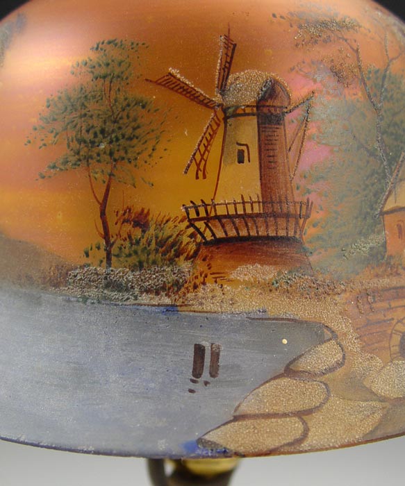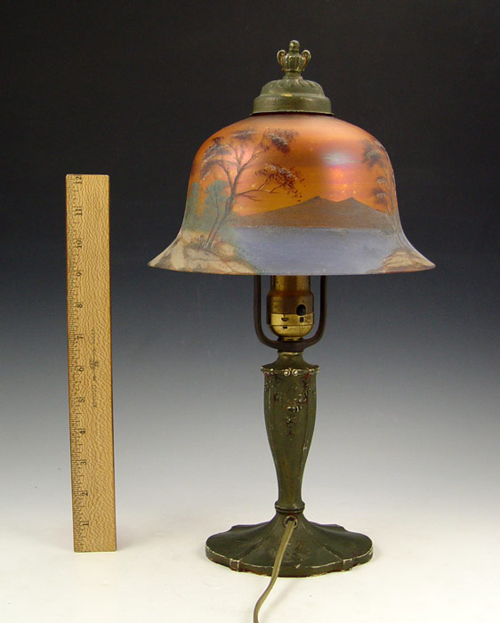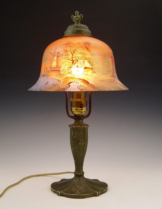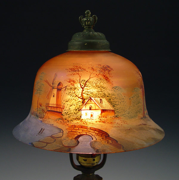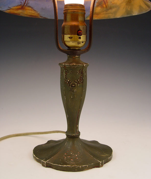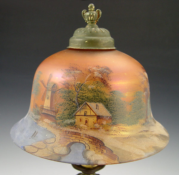 VINTAGE HAND PAINTED SHADE BOUDOIR LAMP: Patinated spelter base. Glass shade with hand painted landscape scene. Base marked ''Made in USA, 127''. Measures 16'' h overall x 9'' shade dia