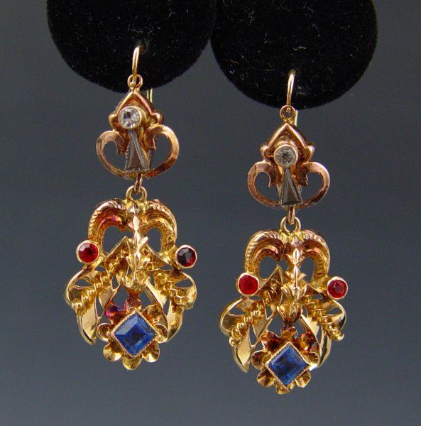 18K GOLD DANGLE EARRINGS: 18K yellow gold earrings contain red, clear and blue synthetic gemstones. The stones are bezel set. Wire and lever back closures. Unknown hallmarks. Weight: 6.2 grams. Length: 1 3/4'' Approx.