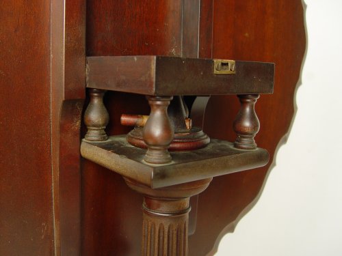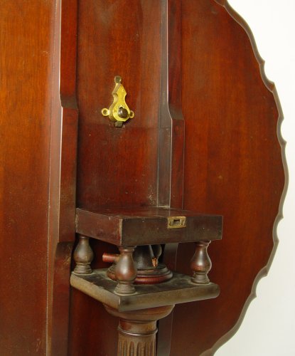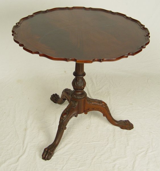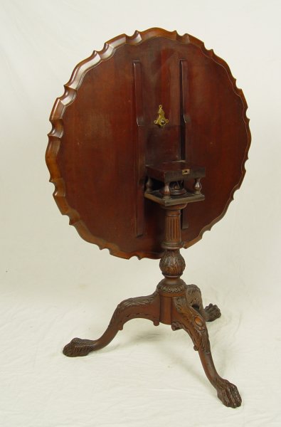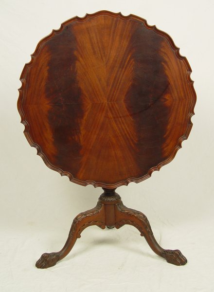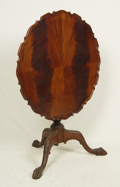 FLAME GRAIN MAHOGANY TILT TOP TABLE: 31 1/2''dia, 44 1/2''h. when up