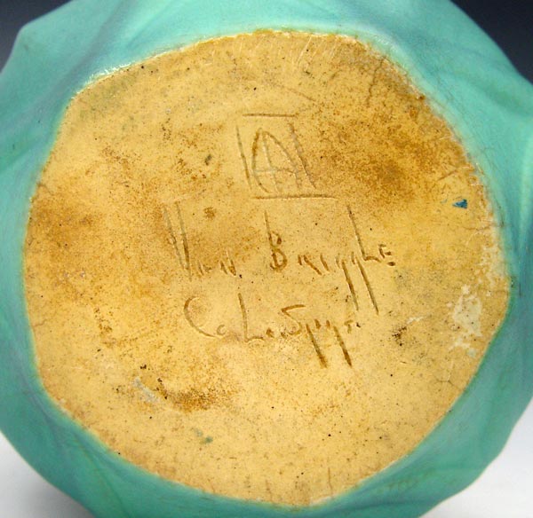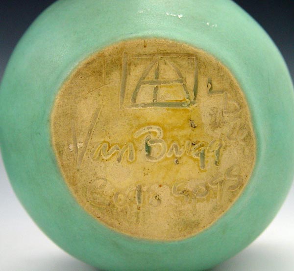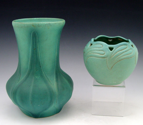 2 VAN BRIGGLE TURQUOISE MING BLUE POTTERY VASES: 1) 9'' tall vase. 2) Rose bowl 4'' tall.