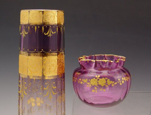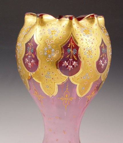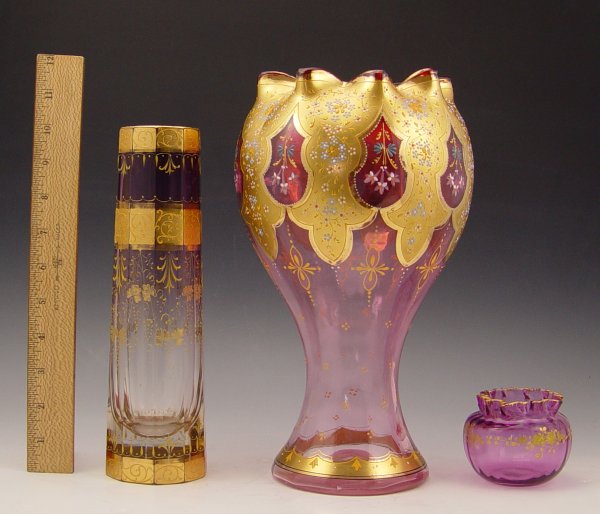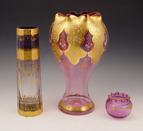 3 PIECE MOSER QUALITY ENAMELED CRANBERRY GLASS: 1) 11 1/2'' tall ruffle rim vase, gilt and enamel decoration. 2) 2 1/2'' rose bowl. 3) A gilt and enamel 10'' panel sided vase.