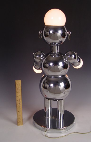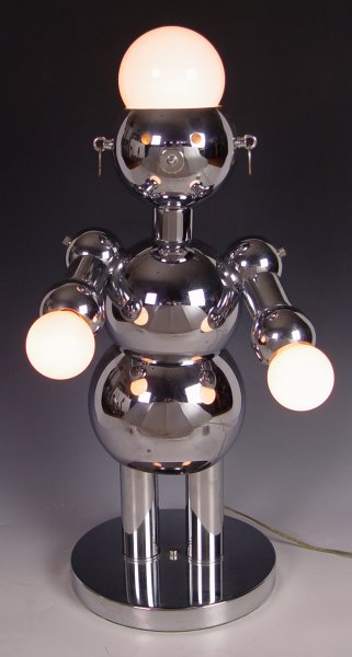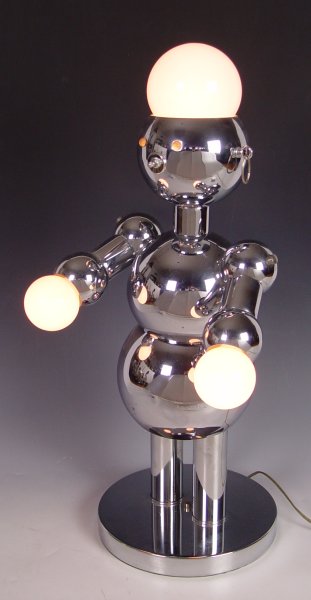 TORINO POLISHED CHROME FIGURAL ROBOT LAMP: Mid century Italian lamp, three way switch in his nose. 28 1/2'' tall, base is 11'' dia. Torino label.