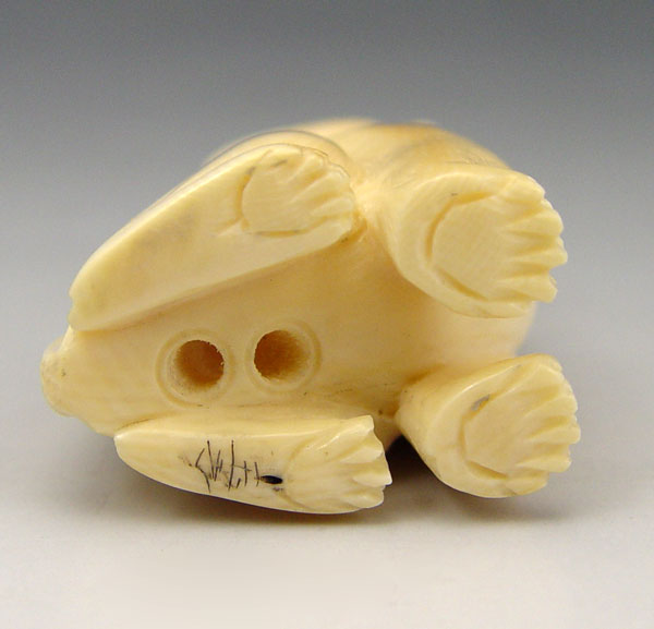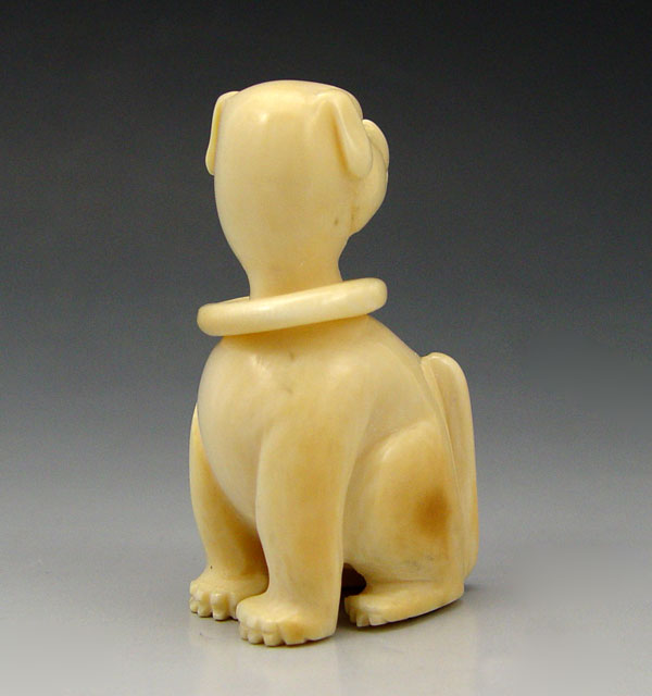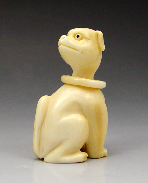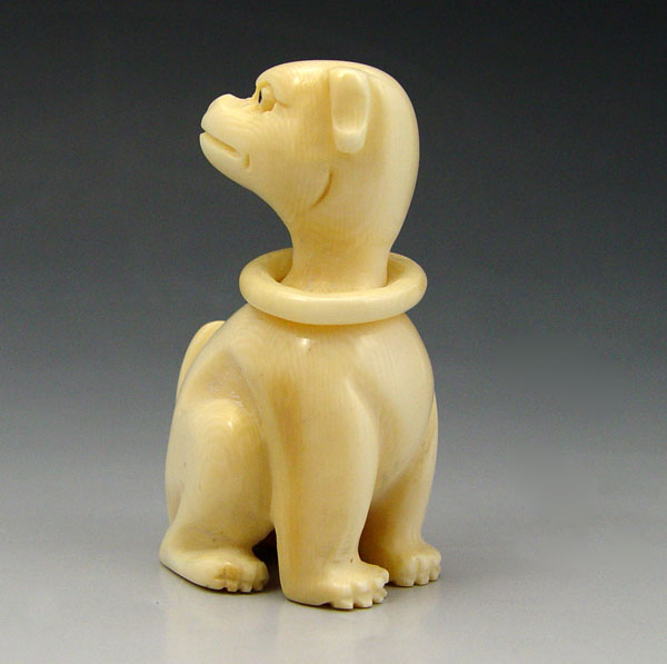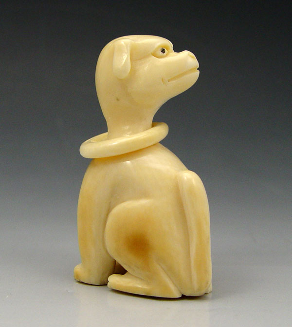 CARVED IVORY DOG NETSUKE: Carved dog with loose collar, signed on base. 2 1/8'' h.