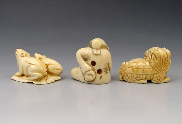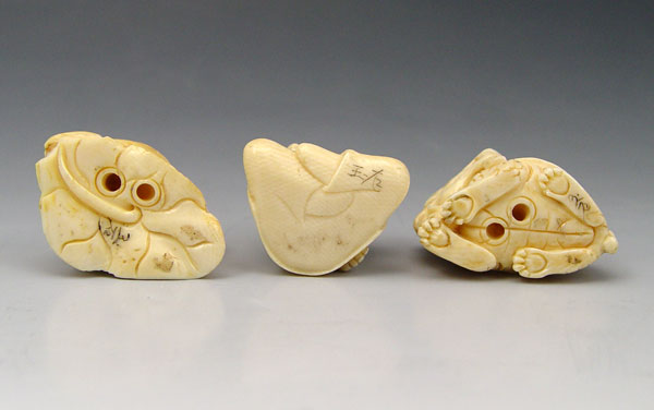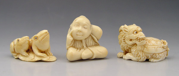 3 PIECE FIGURAL CARVED IVORY NETSUKES: To include 1) Dragon, signed, 1'' h. 2) Seated man, signed , 1 1/4''h. 3) 2 frogs on lilypad, signed, note chip, 7/8''