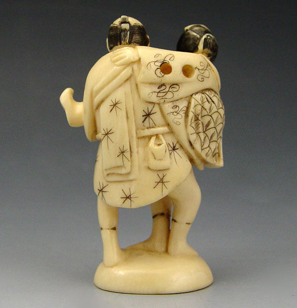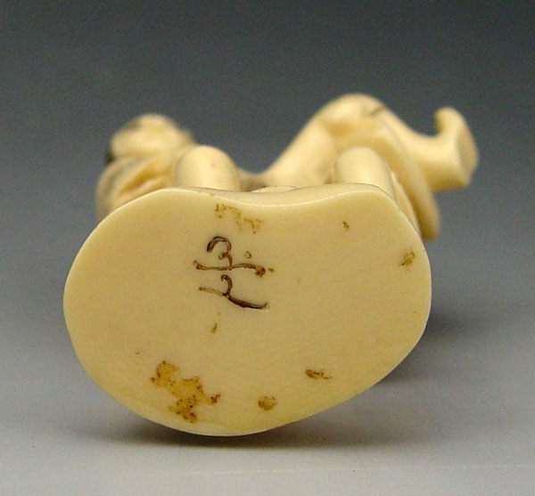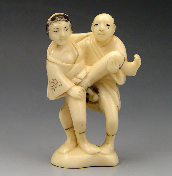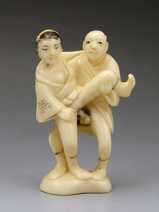 CARVED EROTIC IVORY STANDING COUPLE NETSUKE: Couple in graphic standing erotic pose. Signed on base. 2 1/2'' h.