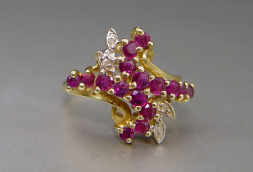 14K RUBY & DIAMOND RING: 14K yellow gold ring contains sixteen round mixed cut rubies. Weight: 2.00 Ct. Approx. The rubies average SI in clarity (Type II), PR/RP in Hue, 4 in Tone and 3-4 in Saturation. Four round single cut diamonds. Weight: .02 Ct. Approx. The rubies and diamonds are prong set. Weight: 4.8 grams. Size: 8
