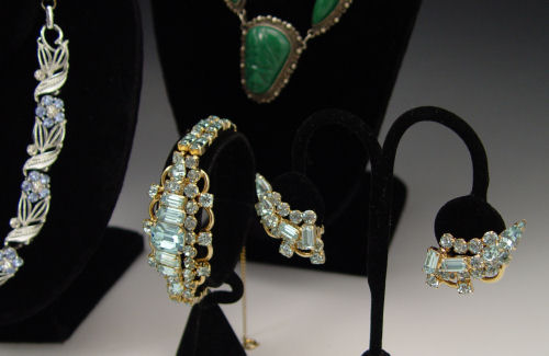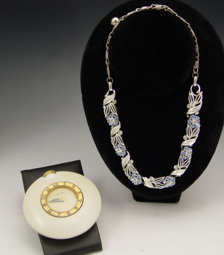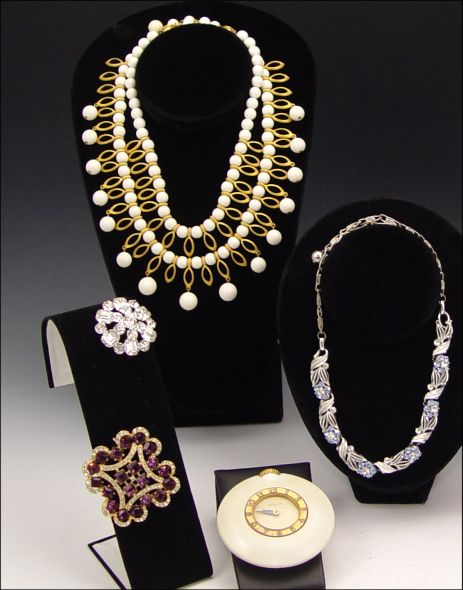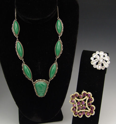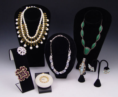 COLLECTION OF SIGNED COSTUME JEWELRY: To include Hattie Carnegie, Kramer, Lisner, Weiss, Mexican sterling & Chrysoprase necklace, Westbox deco clock