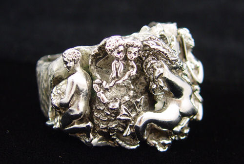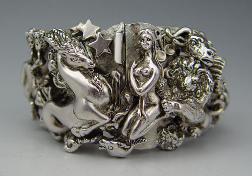 SIGNED TORTOLANI ZODIAC BRACELET: Very chunky hinged clamp bracelet showing three dimensional images from the zodiac. Silverplated pewter. 2'' at the widest.