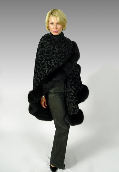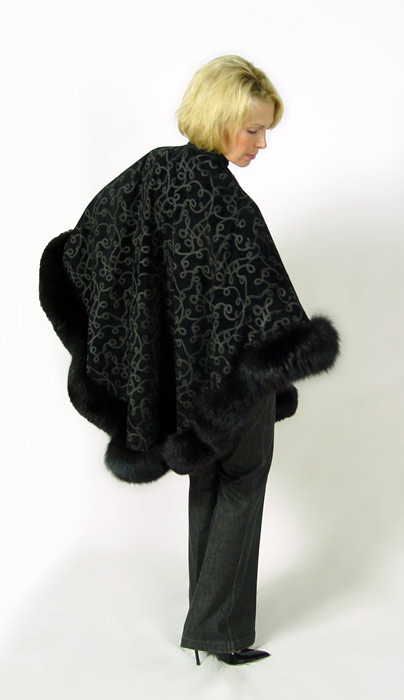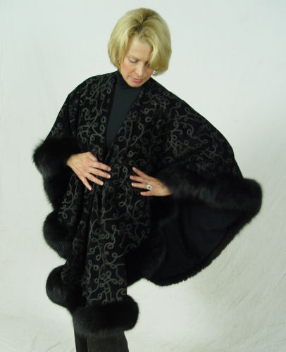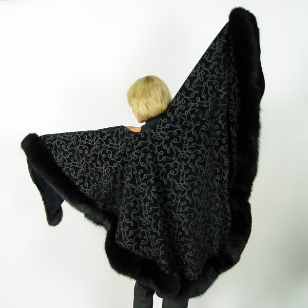 FUR TRIMMED ADRIENNE LANDAU EMBROIDERED SUEDE CAPE: Suede cape with fur trim. Length 36 1/2'', cape span 80''.