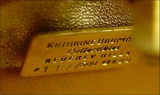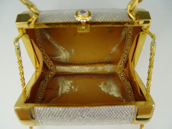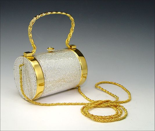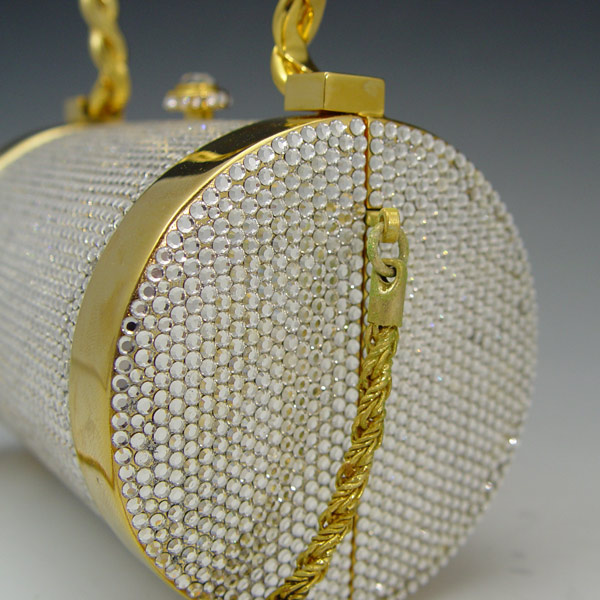 KATHRINE BAUMANN CRYSTAL STUDDED PURSE: Cylindrical form with stationary bale and long chain, leather interior. Kathrine Baumann Beverly Hills tag is intact. 5'' length, 3 1/4'' dia.