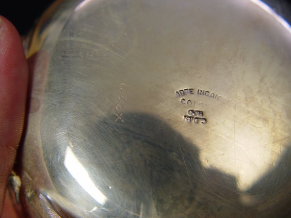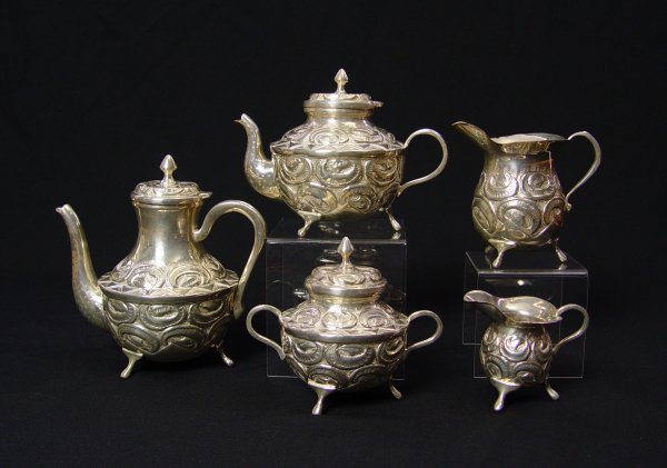 SOUTH AMERICAN SILVERPLATE TEA SERVICE: 5 pieces in the Colonial pattern by Arte Incaico to include 1) Coffee pot with hinged lid, 8'' h. x 8 1/2''. 2) Tea pot with hinged lid, 6 1/4'' h. x 8 1/4''. 3) Covered sugar 5 1/2'' h. x 6 1/2''. 4) Open water pitcher 5 1/4'' h x 5 3/4''. 5) Open creamer 3 5/8'' h. x 4''.