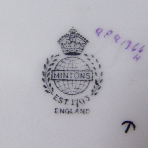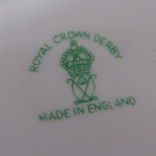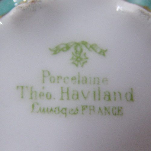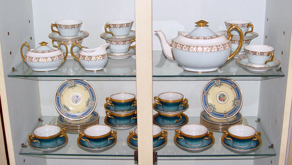 FRENCH LIMOGES, MINTON, AND CROWN DERBY:: 1) Crown Derby teapot, creamer, sugar and 7 cups with saucers. 2) Set of 10 Theodore Haviland bouillon cups and saucers. 3) Set of 12 Minton enamel decorated plates, 6 1/2'' dia.