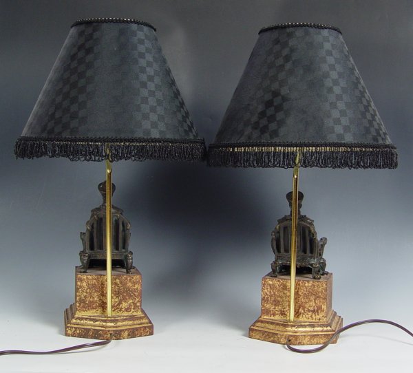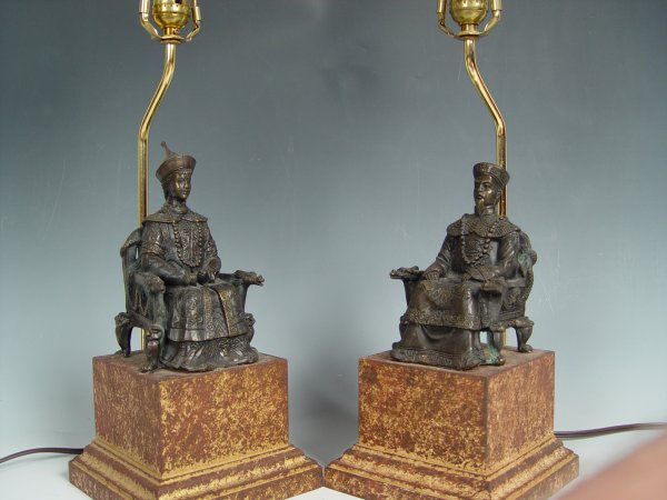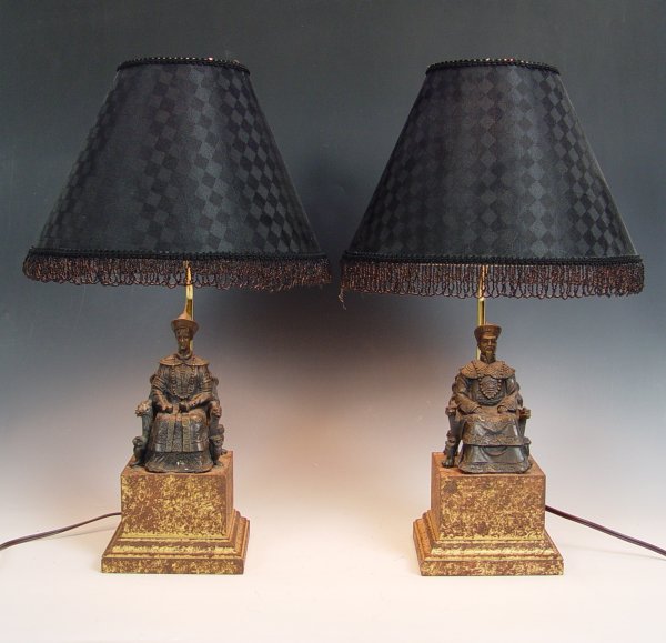 PAIR DECORATIVE CHINESE FIGURAL LAMPS: Contemporary Emperor and Empress figural lamps, black beaded shades, 14''dia., approx. 24 1/2''h. overall.