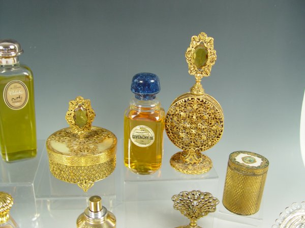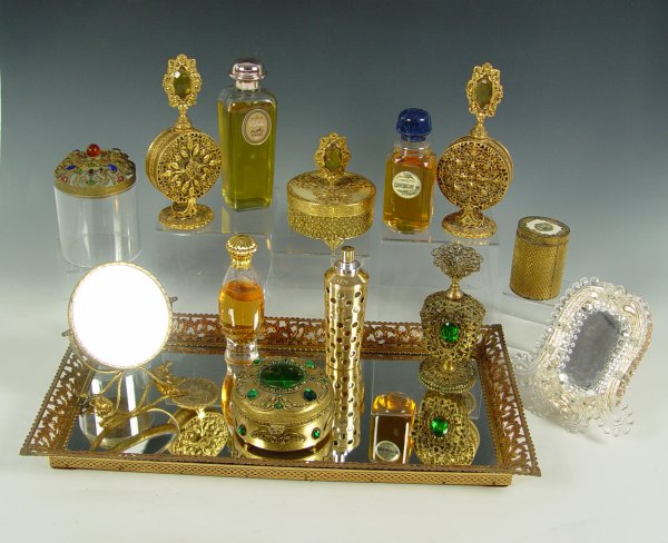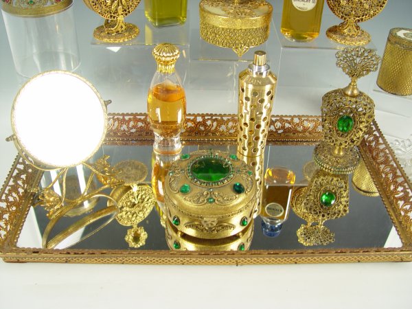 COLLECTION OF JEWELED DRESSER BOXES AND PERFUMES: Mirrored tray full of ''jeweled'' dresser boxes and jars. Included in this estate find is an opened 16 oz. bottle of Hermes' Caliche and an 8 oz bottle of Givenchy III. Also an easel back Venetian glass mirror.