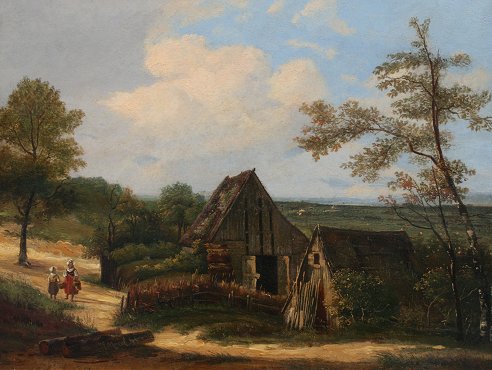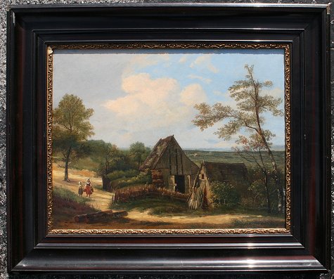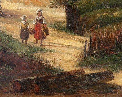 19th C. DUTCH LANDSCAPE WITH FIGURES SIGNED MOREL: OIL/Board, 15 3/4'' x 18 1/8'', varnished wooden frame, 20'' x 24''.