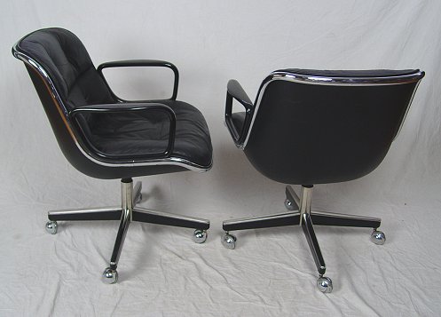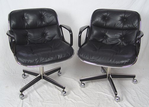 PAIR CHARLES POLLACK FOR KNOLL LEATHER CHAIRS: Black leather chairs on rollers. Knoll International New York label. 32 1/2'' h. x 26'' x 28 1/2''