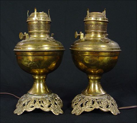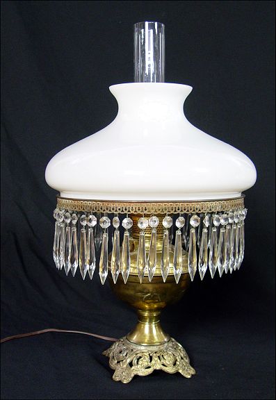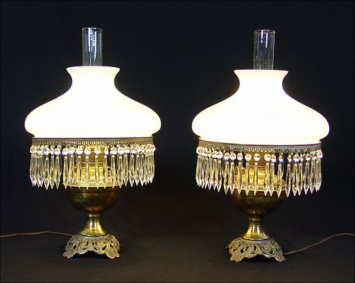 PAIR BRASS LAMPS WITH ELEGANT WHITE SHADES AND PRISMS: Brass oil lamps converted to electricity. White milk glass shades, crystal prisms. The lamps are approx. 23'' to the chimney top, shades are 10'' dia.